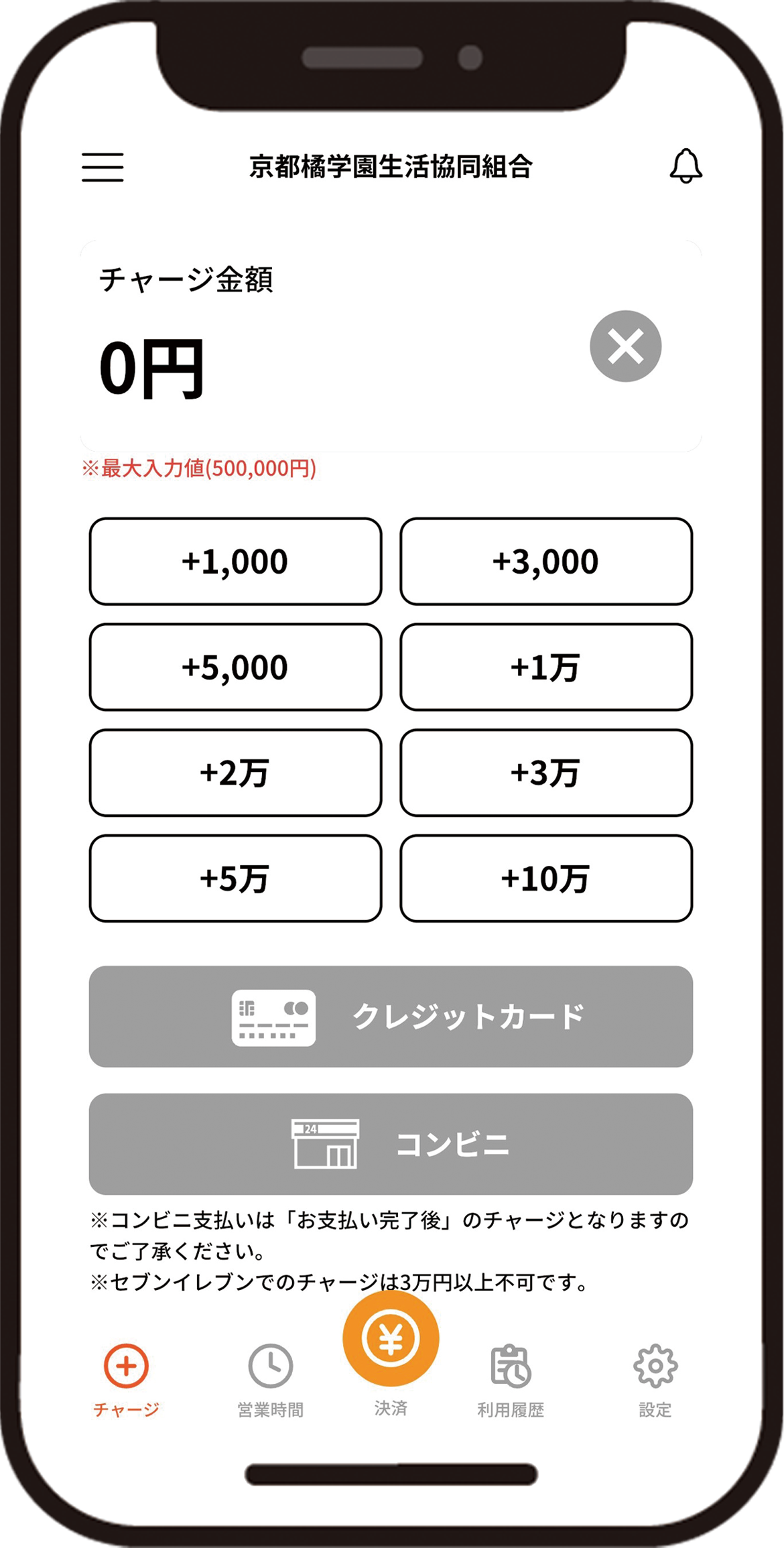アプリのチャージ画面から、金額を選んで、クレジットカード情報を入力してチャージ。