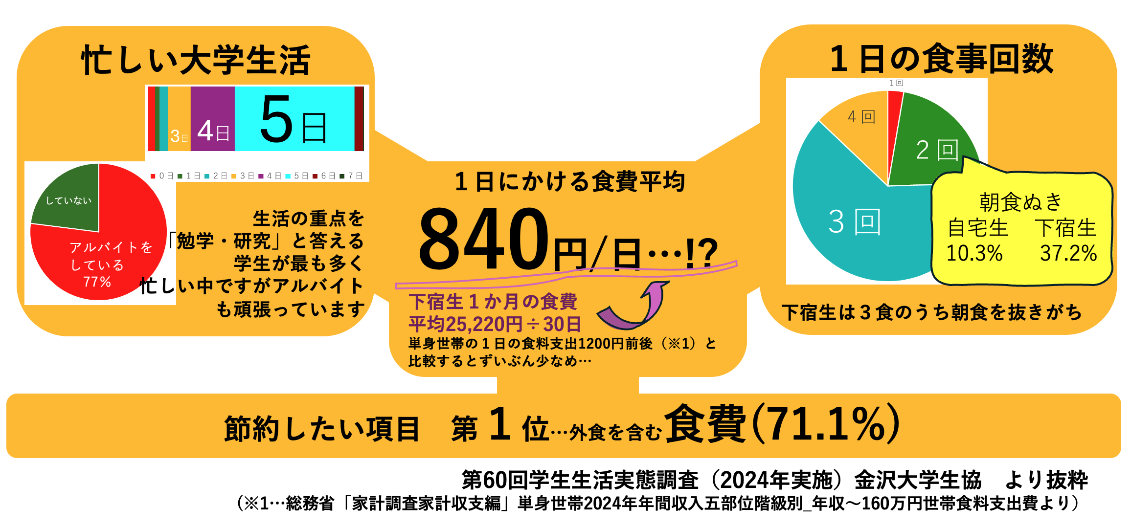 また、学生が節約したいと答える項目のダントツ1位は食費(71.1%)です。