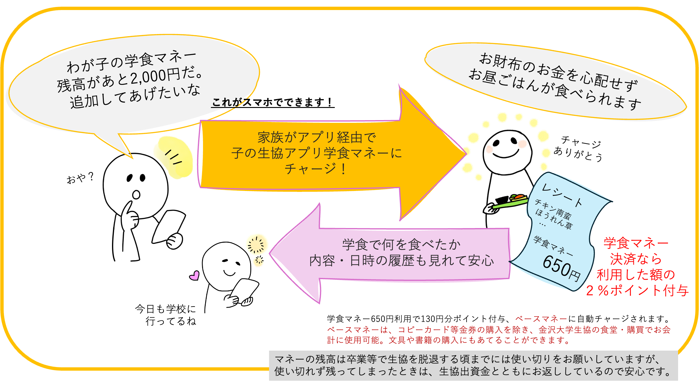 (※生協の食堂で提供した食事にのみご利用いただけます!持ち出しはしないでくださいね。)