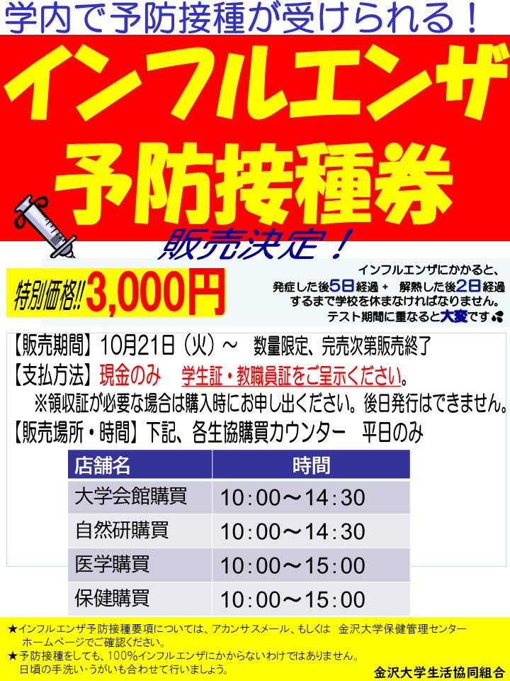インフルエンザ予防接種の接種券を下記の通り販売します。