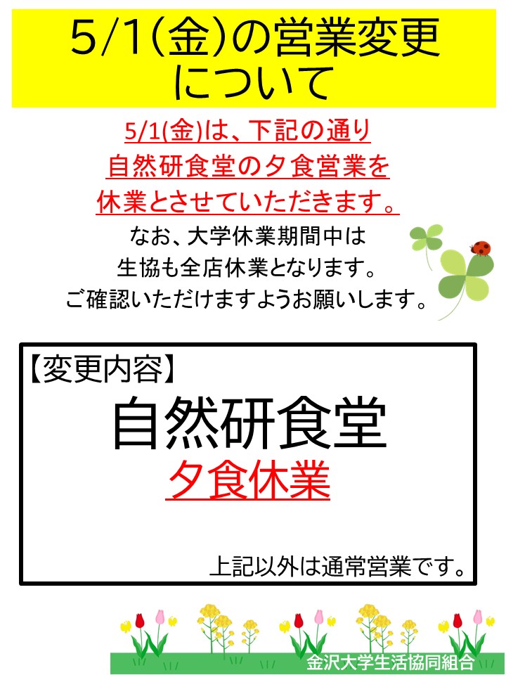 5/1(金)の営業変更について(自然研食堂夕食休業)